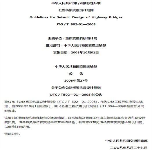 根據(jù)交通部《關(guān)于下達(dá)1999年度建設(shè)標(biāo)準(zhǔn)、規(guī)范、定額等編制、修訂工作計(jì)劃的通知》(交通部公路發(fā)[1999]82號(hào)),由重慶交通科研設(shè)計(jì)院組織對(duì)《公路工程抗震設(shè)計(jì)規(guī)范》 (JTJ 00489)橋梁抗震設(shè)計(jì)部分進(jìn)行修訂,編寫《公路橋梁抗震設(shè)計(jì)細(xì)則》。