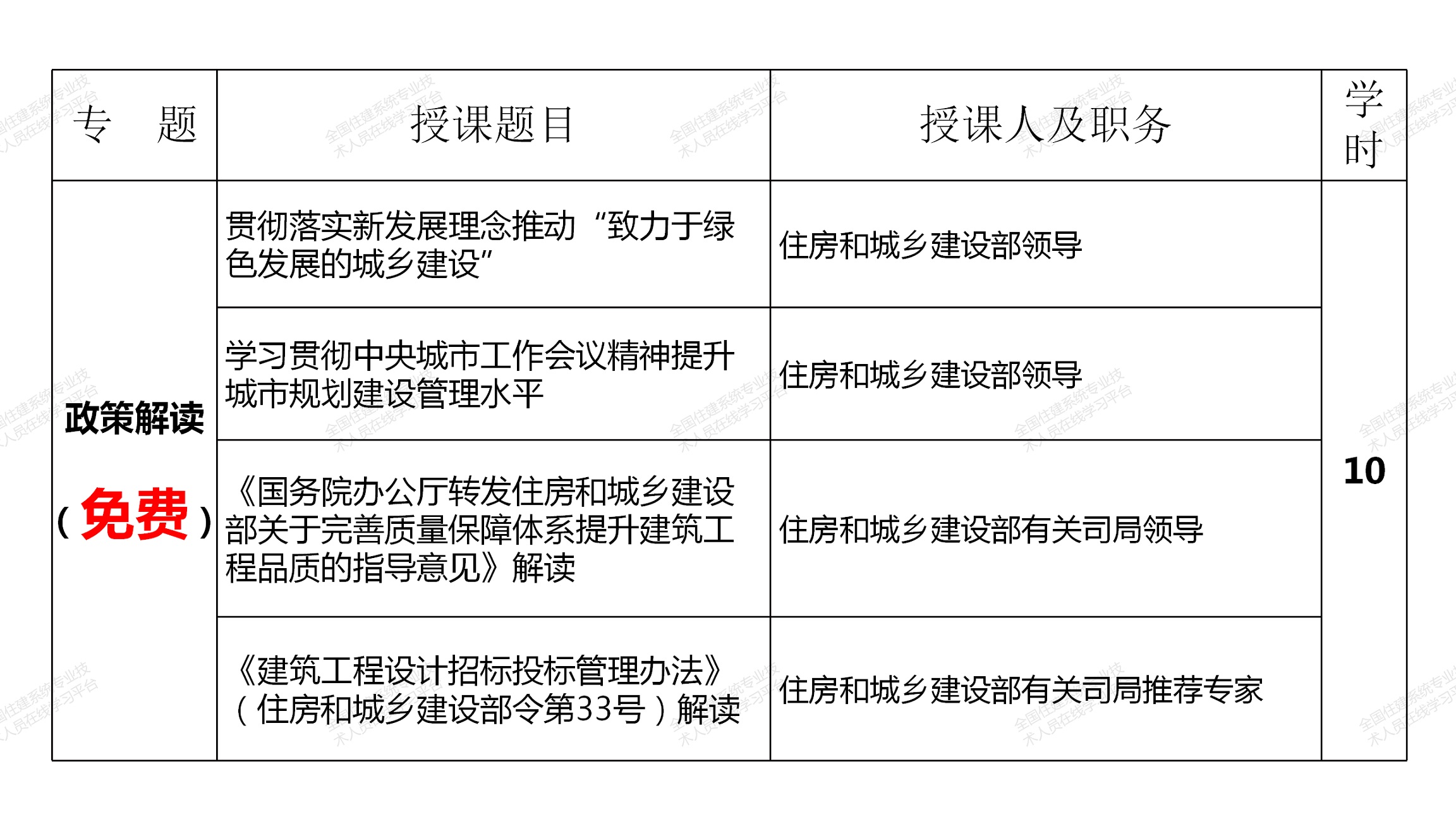 為更好滿足注冊(cè)建筑師對(duì)新技術(shù)、新標(biāo)準(zhǔn)、新政策、新法規(guī)、新理論、新方法等專業(yè)知識(shí)的學(xué)習(xí)需求,提升專業(yè)技能和執(zhí)業(yè)水平,住房和城鄉(xiāng)建設(shè)部干部學(xué)院作為國(guó)家級(jí)專業(yè)技術(shù)人員繼續(xù)教育基地,在“全國(guó)住建系統(tǒng)專業(yè)技術(shù)人員在線學(xué)習(xí)平臺(tái)”(http://www.mayortraining.net)隆重推出注冊(cè)建筑師繼續(xù)教育網(wǎng)絡(luò)課程,課程分為必修課程和選修課程,其中政策解讀專題課程免費(fèi)提供,80余學(xué)時(shí)選修課程可供選擇,師資權(quán)威高端。本套網(wǎng)絡(luò)課程可滿足一級(jí)、二級(jí)注冊(cè)建筑師繼續(xù)教育學(xué)習(xí)。