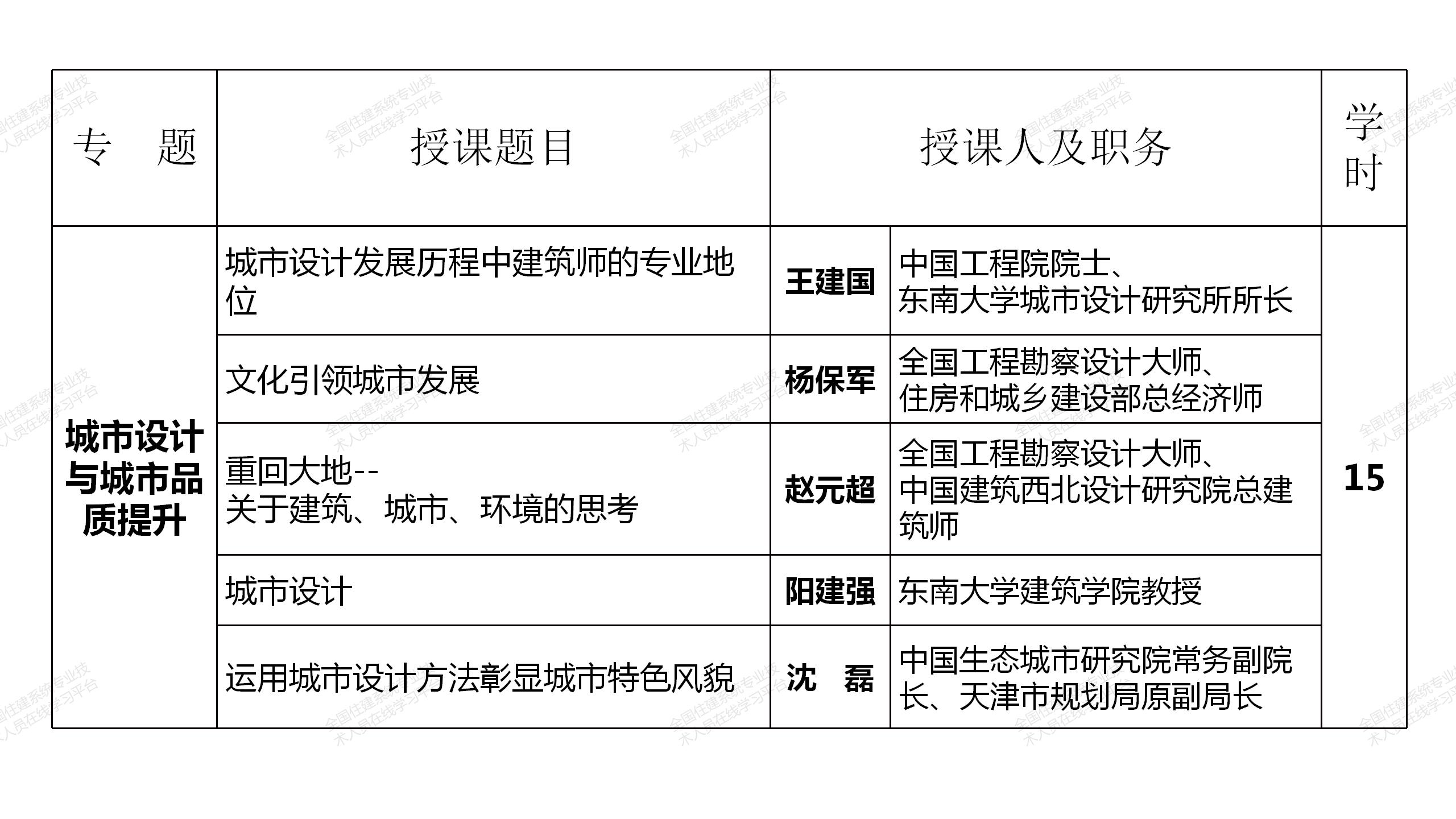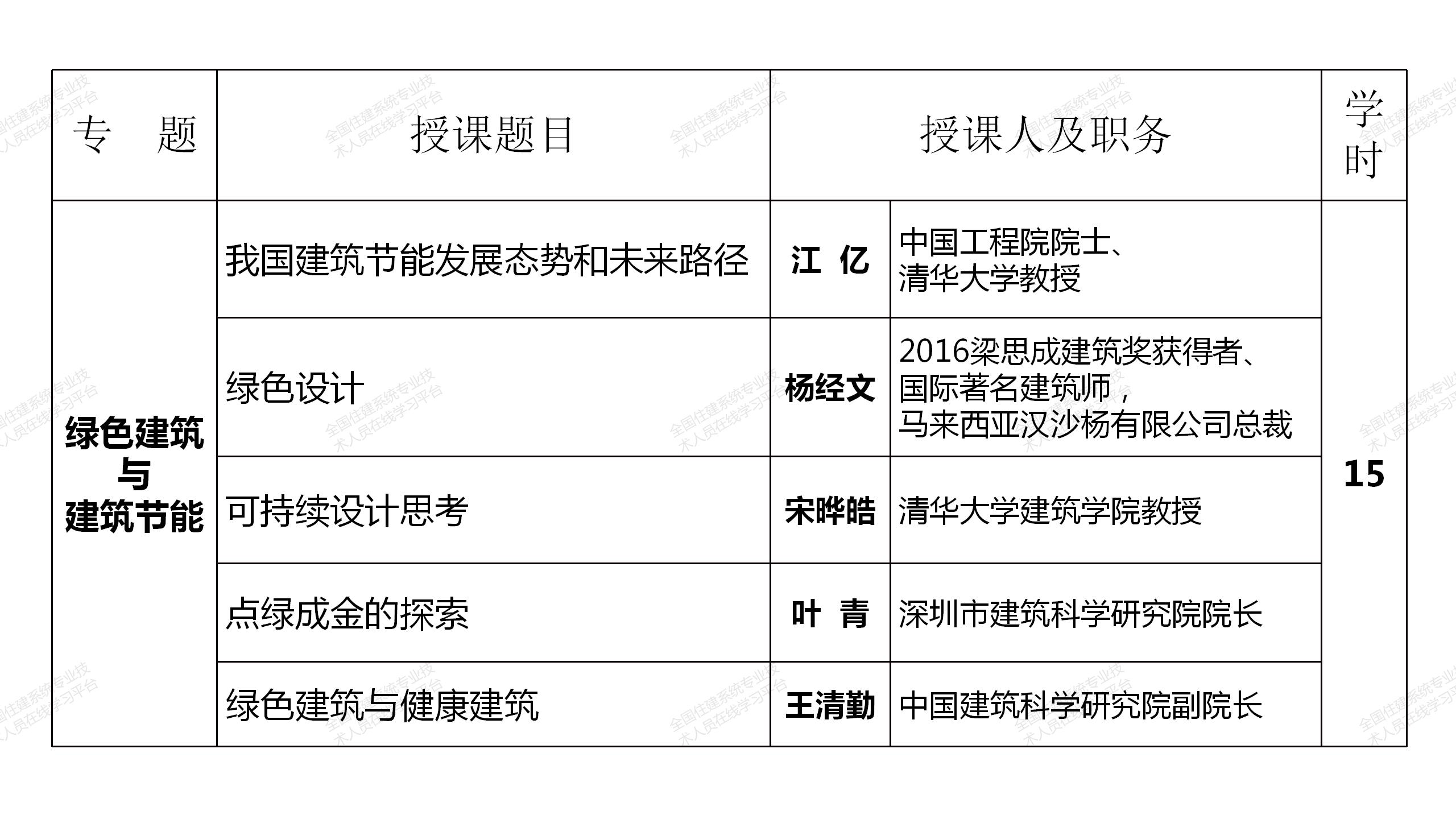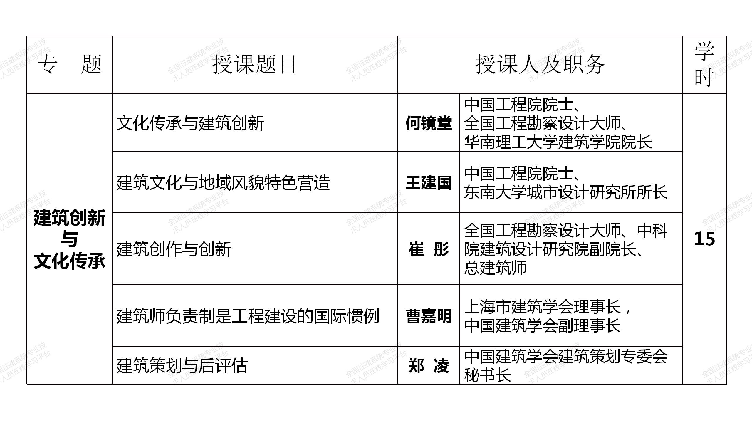 網(wǎng)絡(luò)選修課程由中國(guó)工程院院士、全國(guó)工程勘察設(shè)計(jì)大師和建筑領(lǐng)域著名專家、住房和城鄉(xiāng)建設(shè)部有關(guān)領(lǐng)導(dǎo)主講,分政策解讀、城市設(shè)計(jì)與城市品質(zhì)提升、建筑創(chuàng)新與文化傳承、綠色建筑與建筑節(jié)能、智能建造與建筑工業(yè)化和建筑防火設(shè)計(jì)6個(gè)專題共85學(xué)時(shí)(見附表),注冊(cè)建筑師可根據(jù)自身需要選擇其中40學(xué)時(shí)學(xué)習(xí),其中10學(xué)時(shí)的政策解讀專題課程免費(fèi)提供,并可計(jì)入繼續(xù)教育學(xué)時(shí)。課程緊密結(jié)合國(guó)務(wù)院、住房和城鄉(xiāng)建設(shè)部近年發(fā)布的有關(guān)行業(yè)改革、裝配式建筑、建筑工業(yè)化、智能建造等重大政策,緊跟國(guó)家形勢(shì)發(fā)展需要,是一套集權(quán)威性、系統(tǒng)性、針對(duì)性、實(shí)效性于一體的建筑領(lǐng)域頂尖課程。選修課程于2021年7月12日在“全國(guó)住建系統(tǒng)專業(yè)技術(shù)人員在線學(xué)習(xí)平臺(tái)”(http://www.mayortraining.net)正式上線。