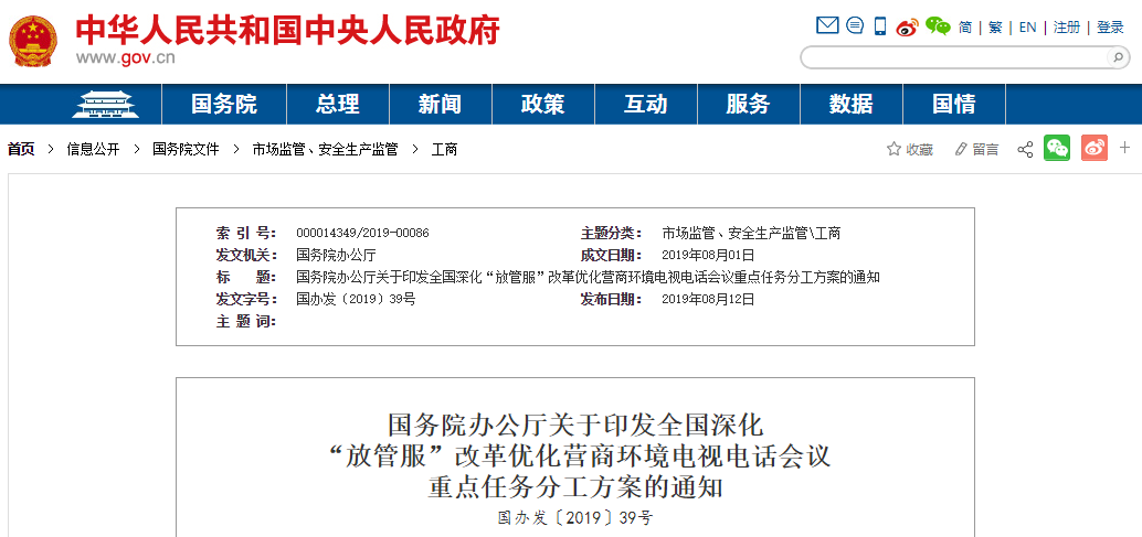 黨中央、國務(wù)院高度重視深化“放管服”改革、優(yōu)化營商環(huán)境工作。2019年6月25日,李克強(qiáng)總理在全國深化“放管服”改革優(yōu)化營商環(huán)境電視電話會(huì)議上發(fā)表重要講話,部署深化“放管服”改革,加快打造市場化法治化國際化營商環(huán)境。為確保會(huì)議確定的重點(diǎn)任務(wù)落到實(shí)處,現(xiàn)制定如下分工方案。