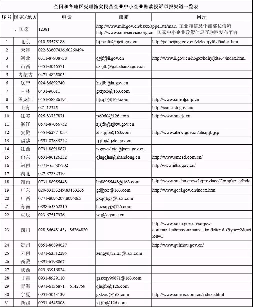 拖欠民營企業(yè)、中小企業(yè)賬款的投訴舉報渠道見下表??赏ㄟ^電話、郵箱舉報,或打開相應網(wǎng)站進行在線投訴。