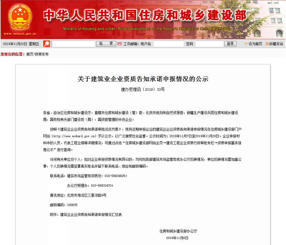 按照《建筑業(yè)企業(yè)資質(zhì)告知承諾審批試點(diǎn)方案》,現(xiàn)將近期申報(bào)企業(yè)的建筑業(yè)企業(yè)資質(zhì)告知承諾申報(bào)情況在住房城鄉(xiāng)建設(shè)部門(mén)戶(hù)網(wǎng)站(http://www.mohurd.gov.cn)予以公示,以廣泛接受社會(huì)監(jiān)督。公示時(shí)間為:2019年11月7日至2019年11月20日。企業(yè)申報(bào)材料中的人員、代表工程業(yè)績(jī)等詳細(xì)情況,可通過(guò)點(diǎn)擊“住房城鄉(xiāng)建設(shè)部網(wǎng)站主頁(yè)→建設(shè)工程企業(yè)資質(zhì)行政審批專(zhuān)欄→資質(zhì)申報(bào)基本信息公示”進(jìn)行查詢(xún)。